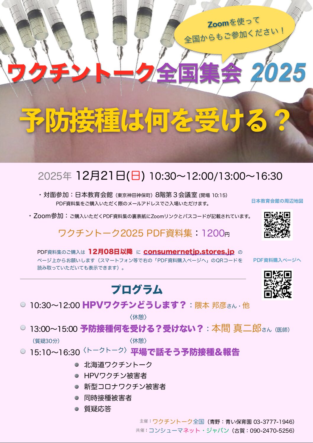 2025年12月21日、日本教育会館で今年も恒例のワクチントーク全国集会を開催します。 HPV(子宮頸がん)ワクチン薬害訴訟も全国での証人尋問等は活発に続けられています。コロナワクチンについても有志医師の会を中心に接種中止に向けた活動が続けられています。 2025年8月31日に「受ける?/受けない?予防接種」を大幅改訂しましたが...