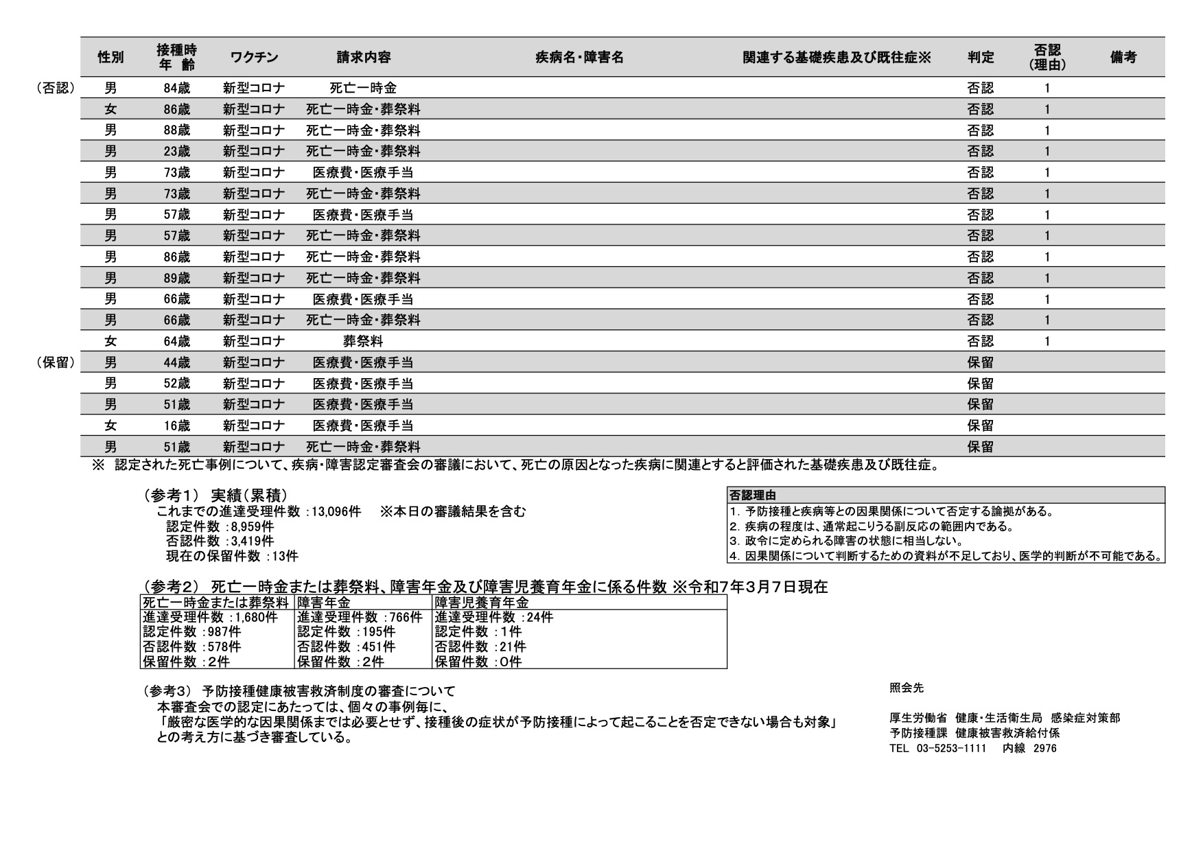 一方で、どれだけの方がワクチン副反応として認定されたのでしょうか。2025年3月17日の疾病・障害認定審査会 感染症・予防接種審査分科会 新型コロナウイルス感染症予防接種健康被害審査第一部会(以下、認定部会)の報告によるとこれまでのコロナワクチンによる副反応被害の進達受理件数は13,163件で、うち認定件数は8,988件、否認件数は3,479件、現在(2025年3月17日)保留件数が19件となっています。