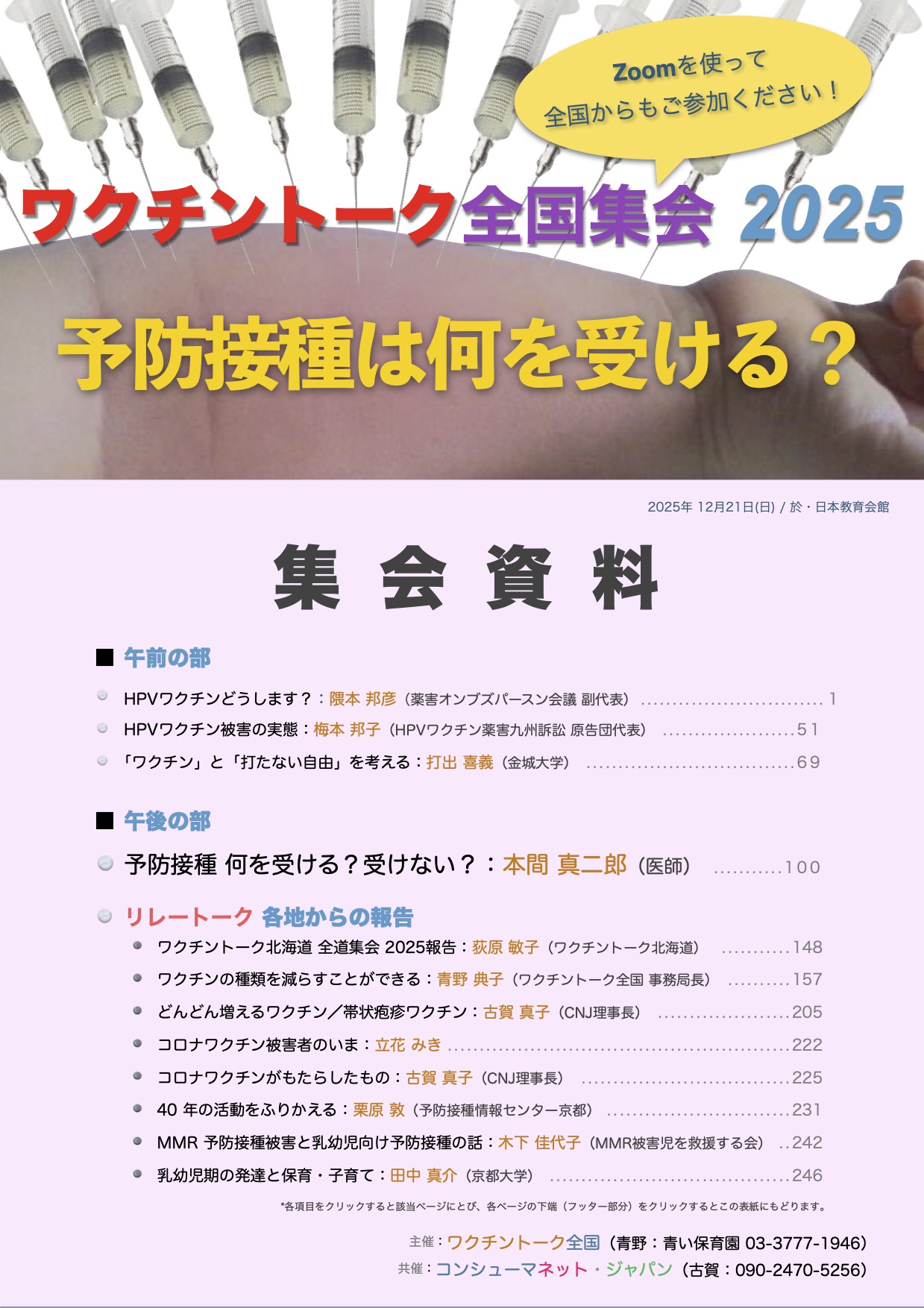 参加ご希望の方は、こちらのページから「ワクチントーク全国集会2025資料集」(PDFファイル A4版 258ページ)をご購入いただいた上で、