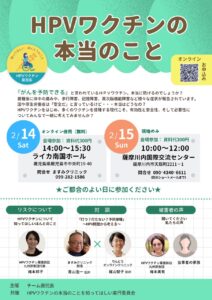 ▼2/14(土)14:00~ライカ南国ホール、15(日)10:00~薩摩川内国際交流センター、「HPVワクチンに本当のこと」(主催:チーム鹿児島、共催:本当のこと実行委員会)